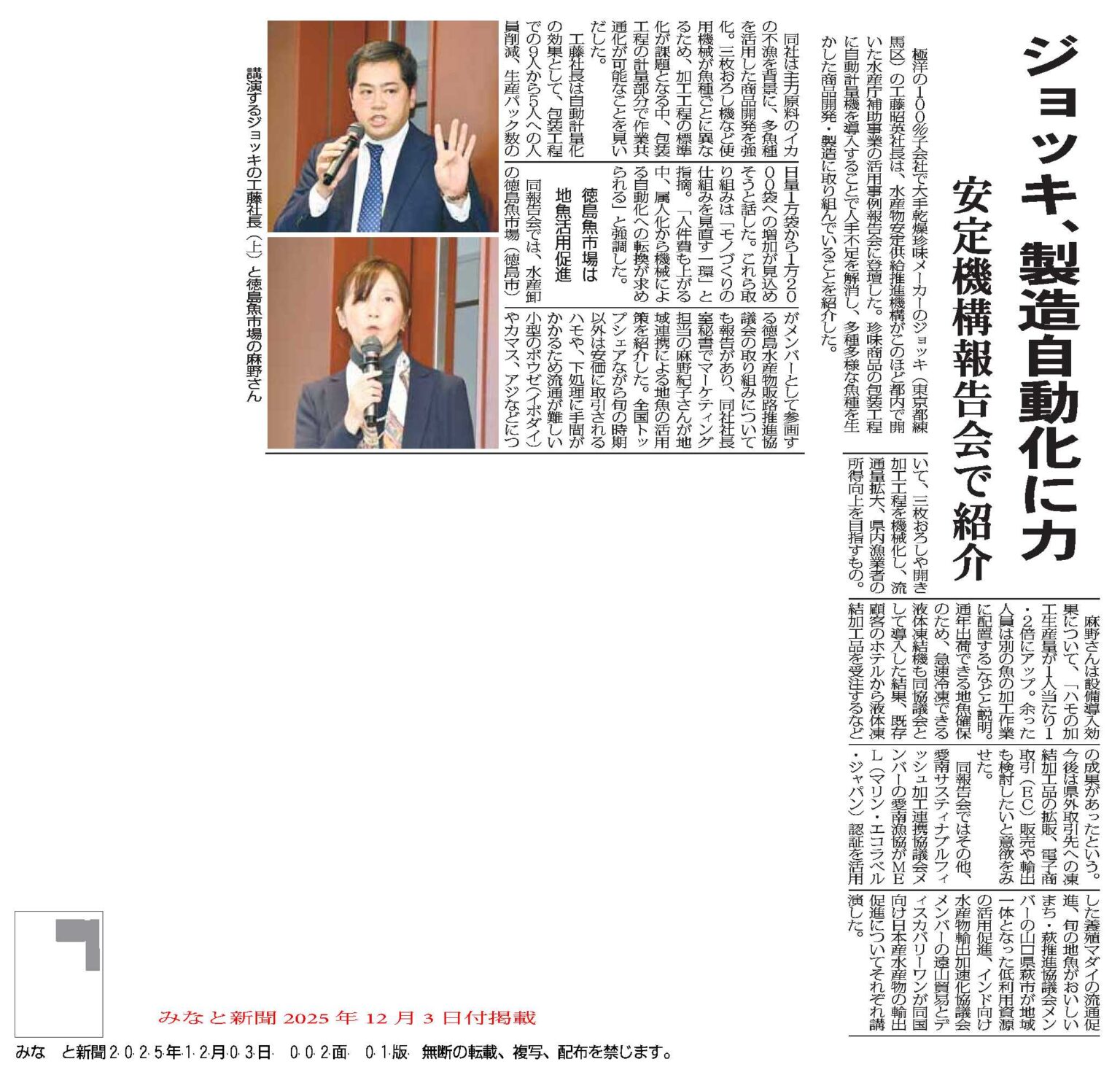 徳島魚市場が参画する「徳島水産物販路推進協議会」の事例報告会がみなと新聞で紹介されました。