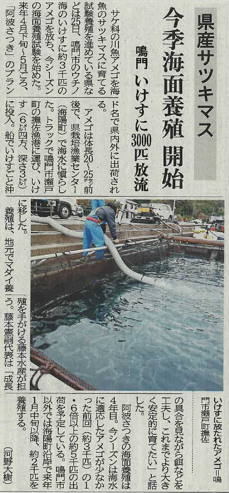 県産サツキマス 今季海面養殖開始 徳島新聞